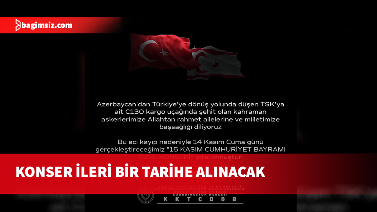 Daire’den yapılan açıklamaya göre, “Türkiye Milli Savunma Bakanlığı’na ait askeri uçağın kaza geçirmesi ve şehit Mehmetçiklerimizin yasını tuttuğumuz bu süreçte konserin ileri bir tarihe alınmasına karar verilmiştir. Tüm halkımıza duyurulur.” ifadelerine yer verildi.