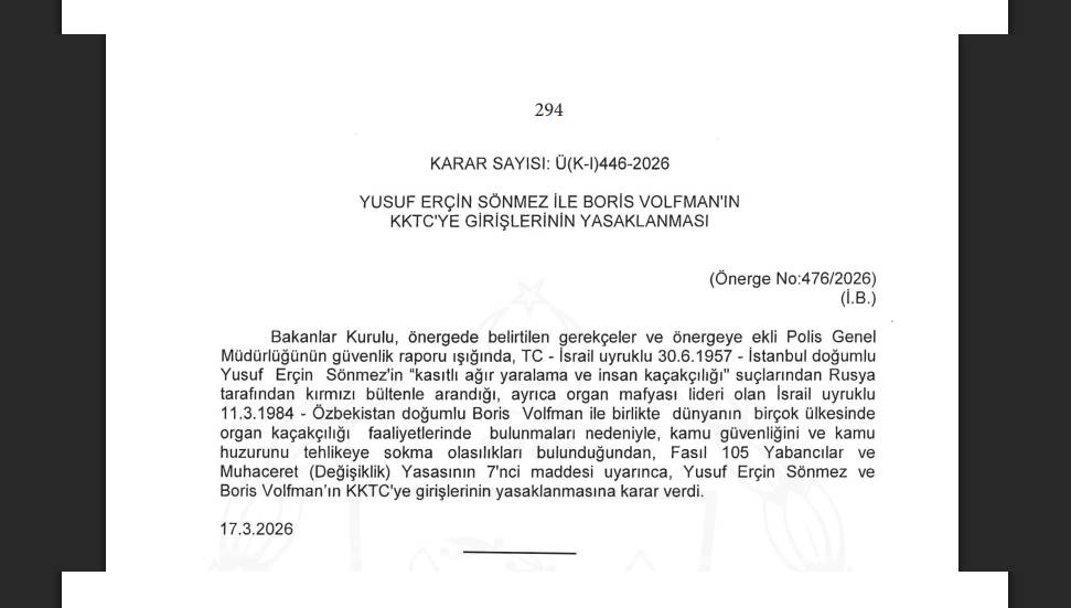 Resmi Gazete’de yayımlanan karara göre, Polis Genel Müdürlüğü’nün güvenlik raporu doğrultusunda alınan kararda, İstanbul doğumlu İsrail uyruklu Yusuf Erçin Sönmez’in “kasten ağır yaralama ve insan kaçakçılığı” suçlarından Rusya tarafından kırmızı bültenle arandığı belirtildi. Ayrıca Sönmez’in, uluslararası düzeyde organ mafyası lideri olduğu da bildirildi.