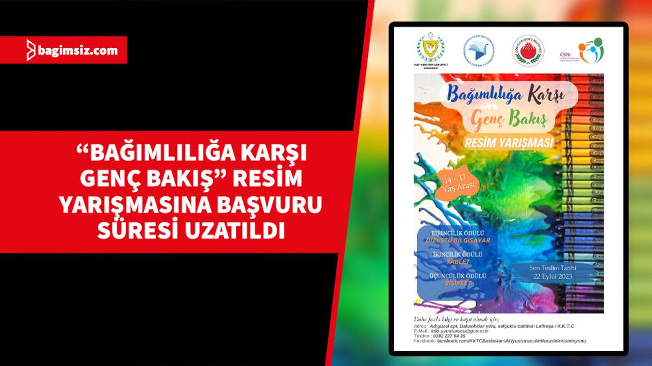 Başbakanlık Uyuşturucuyla Mücadele Komisyonu, Gönyeli - Alayköy Belediyesi ve Bilişsel Davranışsal Psikoterapiler Derneği iş birliği ve ortaklığıyla yapılacak "Bağımlılığa Karşı Genç Bakış" isimli resim yarışmasına başvurular 2 Kasım Perşembe güne kadar uzatıldı.