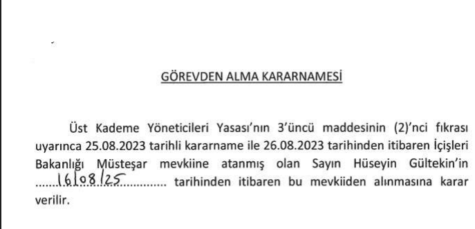 Resmi Gazete’de yayımlanan karara göre, İçişleri Bakanlığı Müsteşarı Hüseyin Gültekin görevden alındı. Müsteşarlık görevine Suat Yeldener atandı.