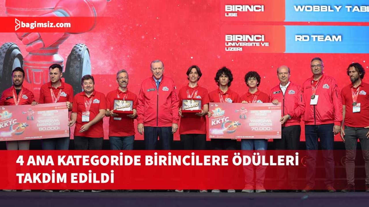 Cumhurbaşkanı Recep Tayyip Erdoğan ve KKTC Cumhurbaşkanı Ersin Tatar'ın katılımıyla dün gerçekleştirilen törende, Turizm Teknolojileri Yarışması, Sosyal İnovasyon Yarışması, TEKNOFEST Robolig Mavi Vatan Yarışması ve TEKNOFEST KKTC Araştırma Proje Yarışması'nda birinci olan takımlara ödülleri takdim edildi.