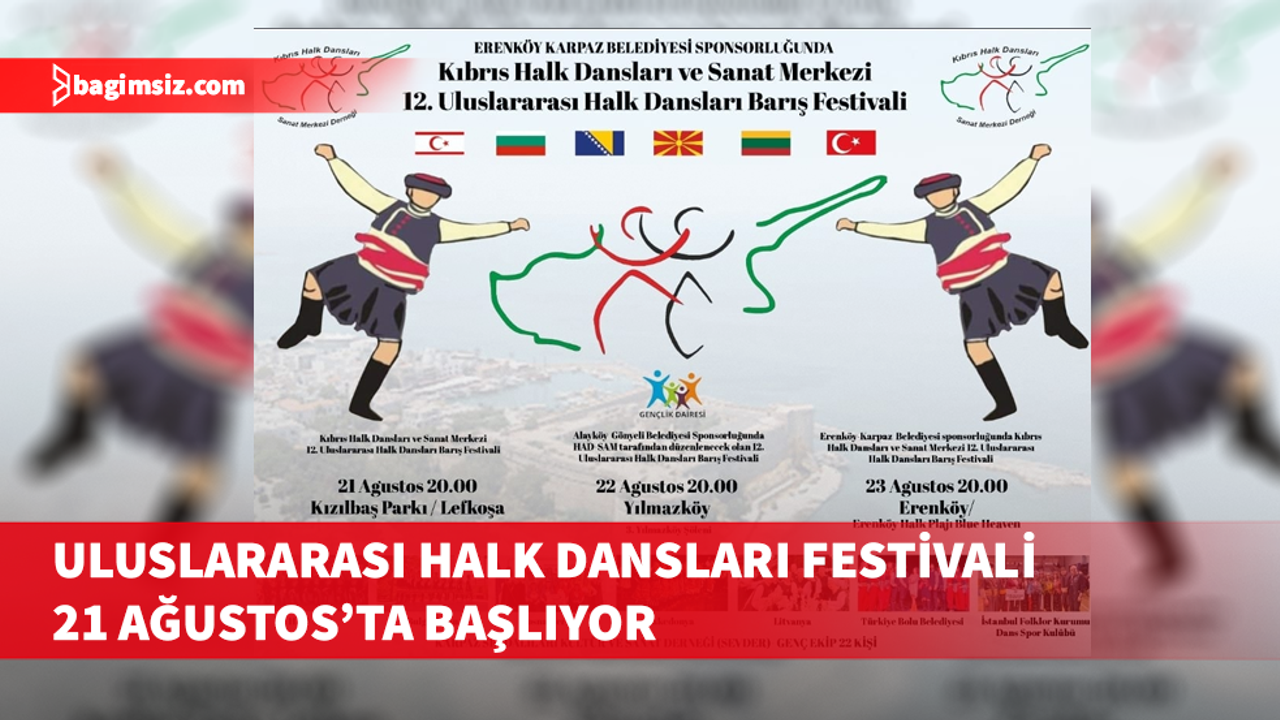 Buna göre, 12’nci Uluslararası Halk Dansları Barış Festivali 21 Ağustos’ta Lefkoşa Kızılbaş Parkı’nda, 22 Ağustos’ta Yılmazköy’de ve 23 Ağustos Yenirenköy Halk Plajı’nda olacak. Tüm gösteriler saat 20.00’de başlayacak.